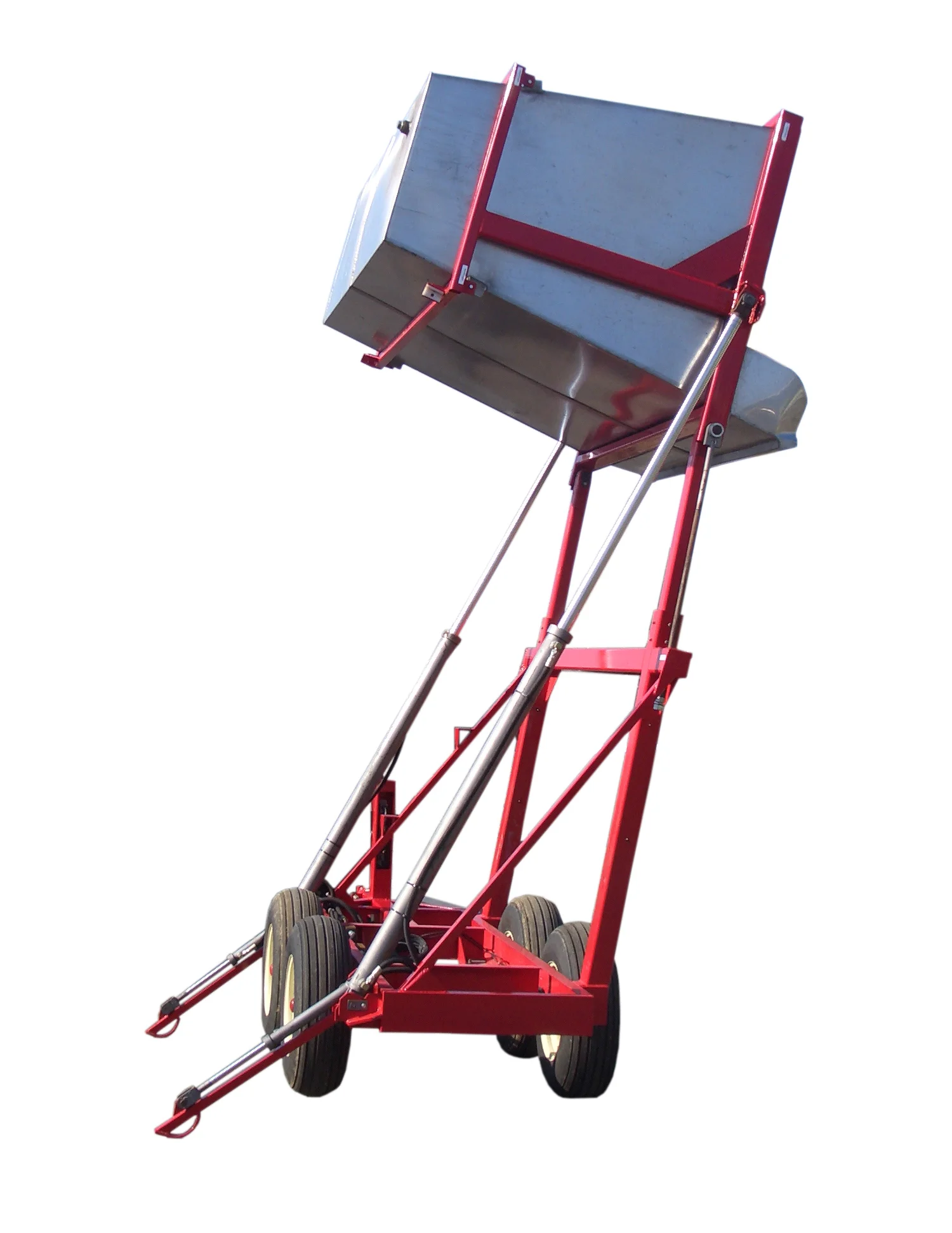 The Western Square Big Dipper is a 3-ton harvest bin with a specially designed hydraulic system that, with your help, will lift and dump itself. The Big Dipper is designed for use with a mechanical harvester and is perfect for six foot wide vineyard rows.